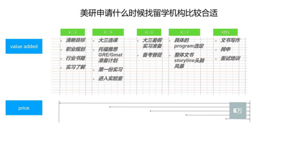上述我们写的都是一个的留学机构在学生整个的留学申请中会产生价值的环节,我们要知道,不管你什么时候与留学机构签约,你所付出的价格是一样的,但是签约越晚,你所得到的服务就越少,他能塑造你的环节就越少…直至前文我们提到大四学生的极端案例,他们几乎是在大四上学期10月份的时候,花了全款仅仅买了一篇文书的写作…这样真的很浪费钱。